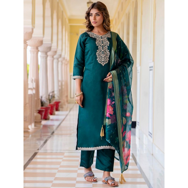 VredeVogel Kurta Set with Dupatta | Viscose Roman Silk Embroidered Kurta Set ...