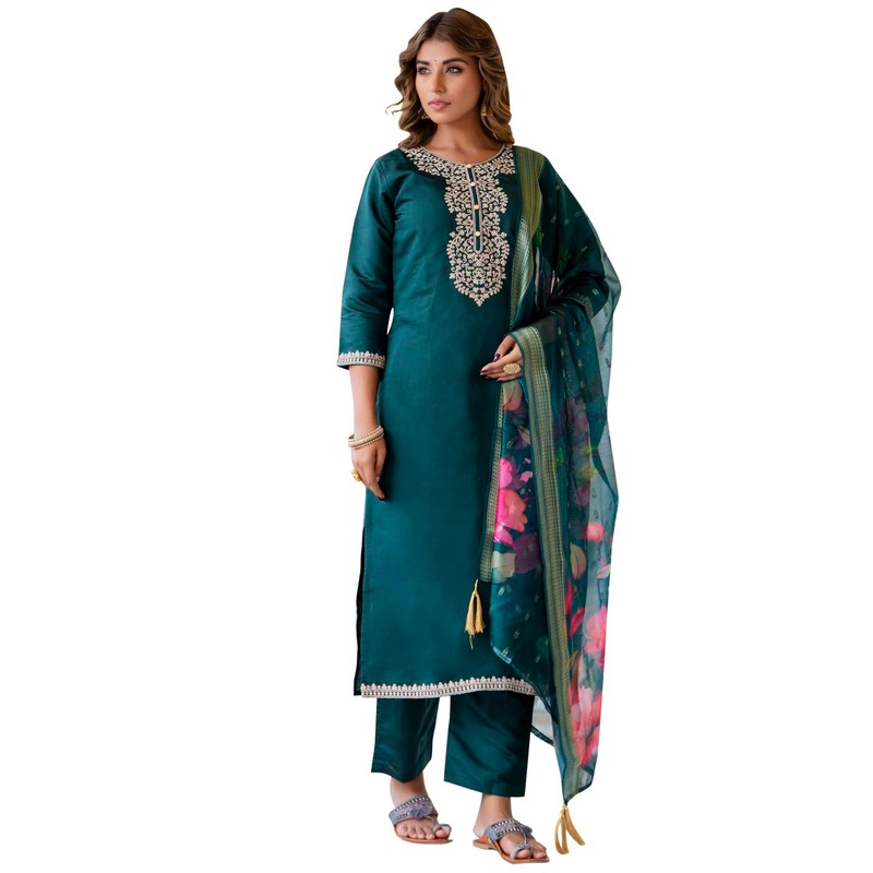 • Fabric: Viscose Roman Silk || Dupatta Fabric: Organza Print with jecard border dupatta 2.10 meter|| Pattern: Embroidered