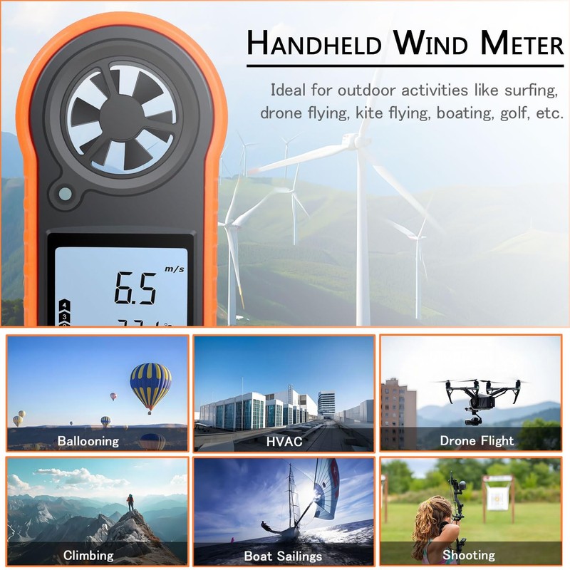 - [ Various Allplications ] This Anemometer Provides Fast Measurement for Analysis of Environment Conditions, Ideal for industrial and home purposes, Such as Measuring Wind Speed, Air Blower, Temperature of CPU Computer Fans, and Also Use for Windsurfing, Sailing, Fishing, Drone Flying and Mountaineering.