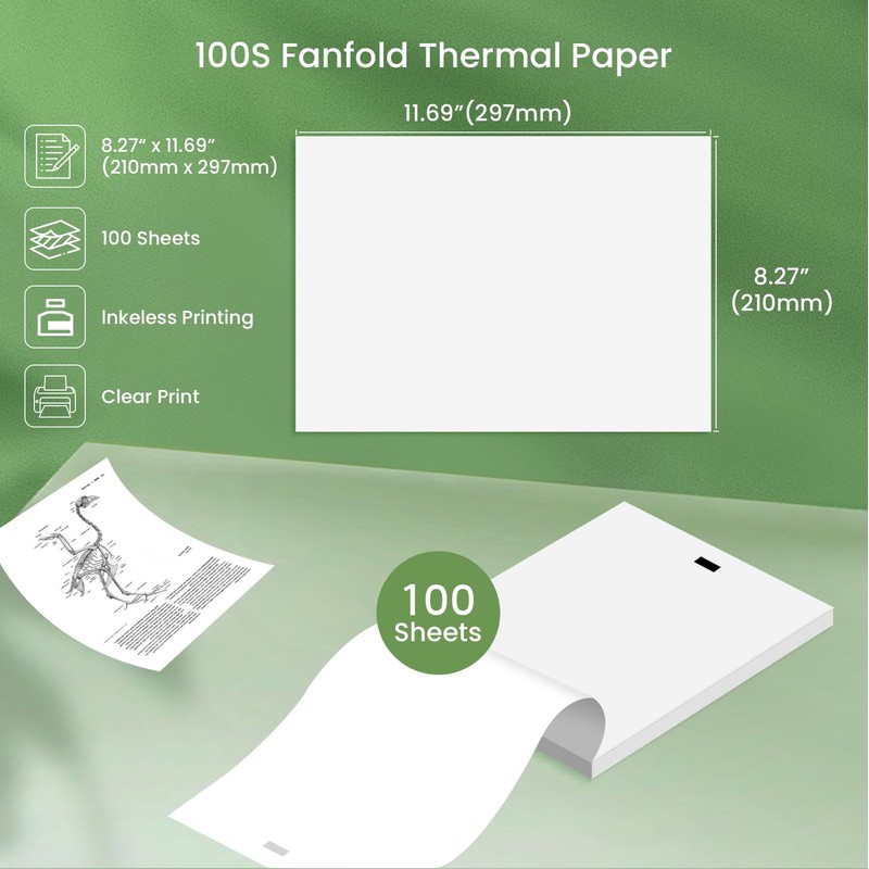 vretti A4 Foldable Thermal Printer, Thermal Printer Paper Compatible with P83 Portable Printer and Other Portable A4 Printers, 210 x 297 mm (8.27 x 11.69 inches) Thermal Paper, 100 Sheets