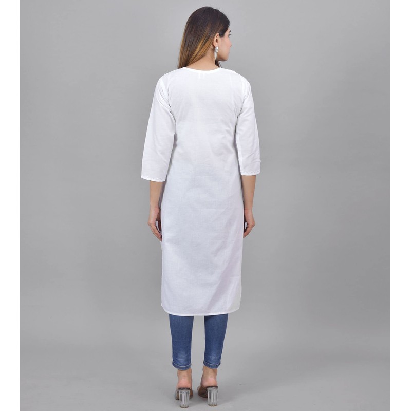Vrnda Indian Hand Embroidered Lucknowi Chikankari Straight Knee Length White Cotton Kurti Pakistani Long Kurta For Women (XL)