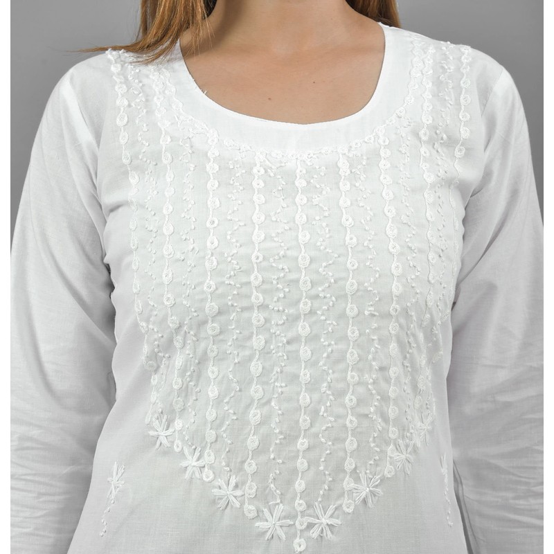 Vrnda Indian Hand Embroidered Lucknowi Chikankari Straight Knee Length White ...