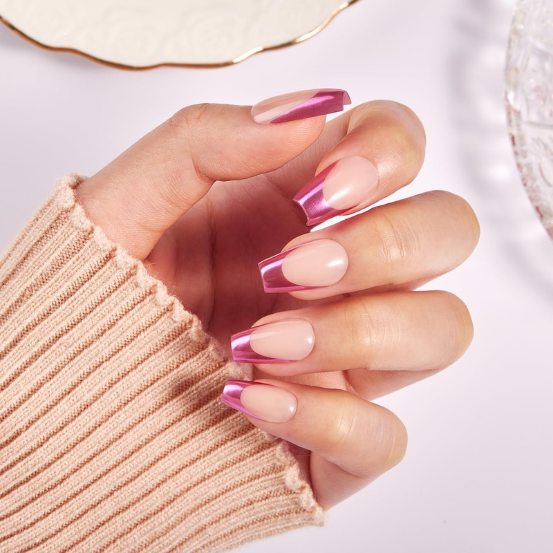 VSALON Press-On Nails - Short Coffin Pink Metallic French Tip Design, 32 PCS in 16 Sizes, Reusable Nail Kit with Long-Lasting UV Glue, Adhesive Tabs & Nail Glue (Artemis)