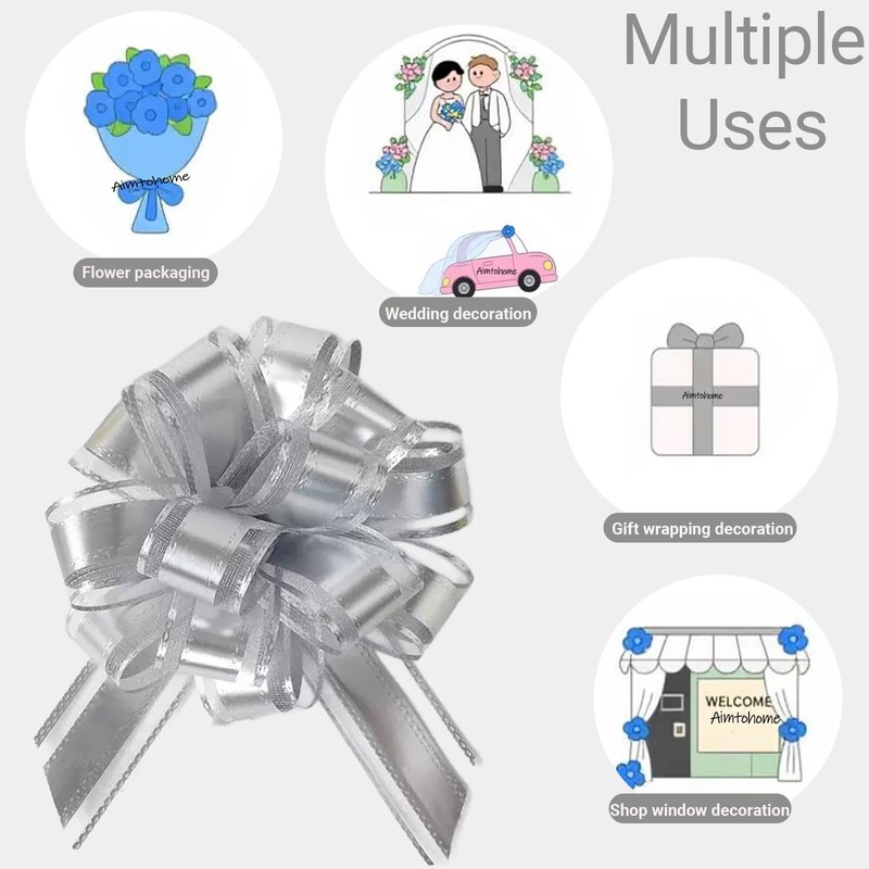 - SMALL PULL BOWS SIZE & MATERIAL: Approximately 4 inches wide when formed, Bows come flat and compact for convenient storage, transforming into full, dimensional reusable decorations when needed,crafted from silver-toned satin-style ribbon with organza edges