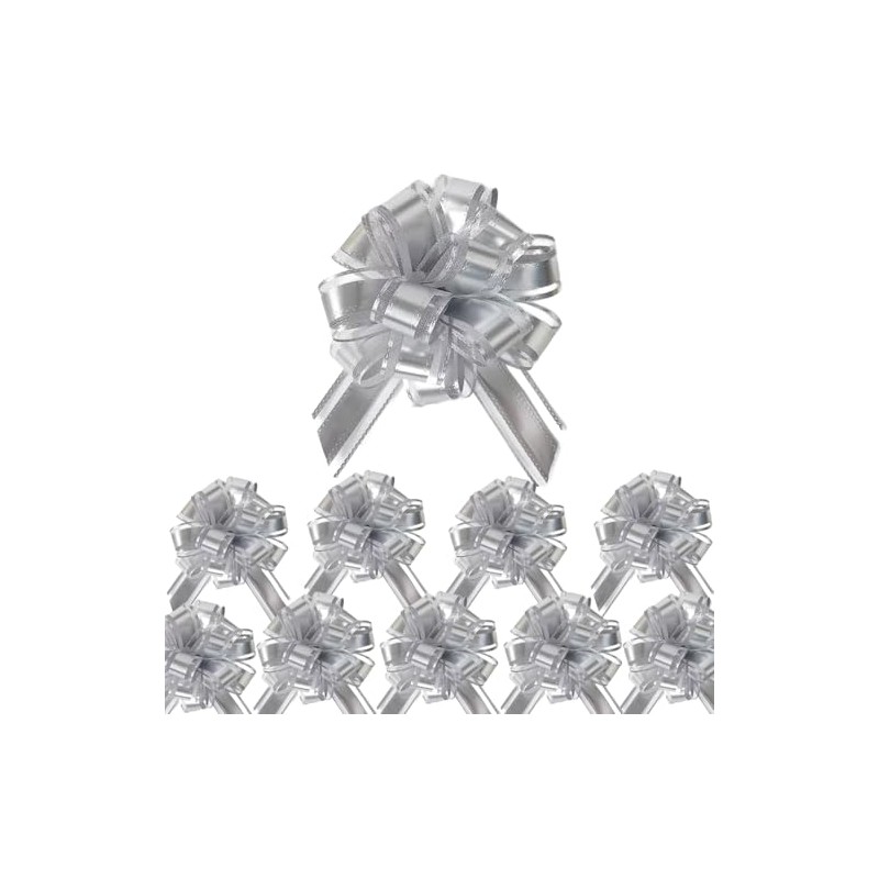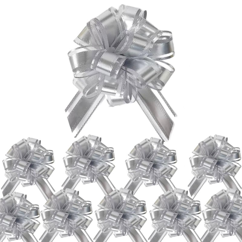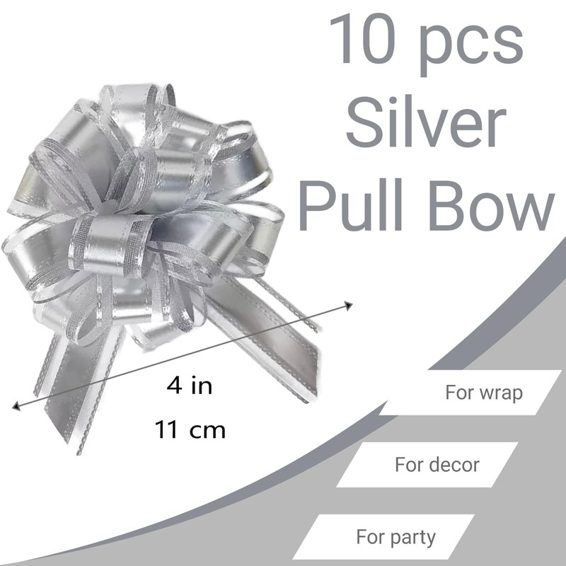 - PULL BOWS PACKAGE CONTENTS: Set of 10 elegant silver pull bows, each measuring 4 inches in diameter when fully assembled - perfect for gift wrapping and decorations