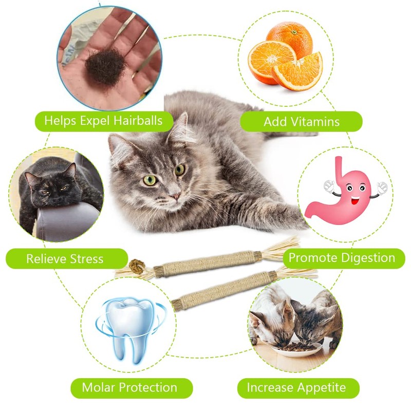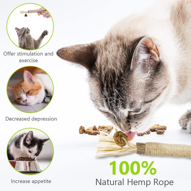 - Natural material: 6 pieces chew sticks for cats, pulled from the material that attracts cats to play in nature, raffia fibre and polyethylene fibre, filled with fruits for chewing fruits, hemp rope attached to make the toy more bite-resistant and relieve stress, make your cat feel calm and relaxed.