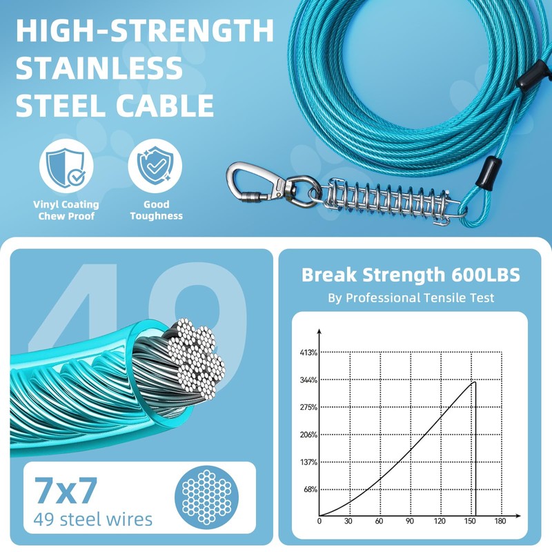 - 600LBS STRENGTH STURDY CABLE: Made of robust 7x7 steel wire, this leash features a tight, sturdy construction that can withstand up to 600LBS of force. The vinyl coating is not only chew-proof but also weather-resistant, making it adaptable to various environments