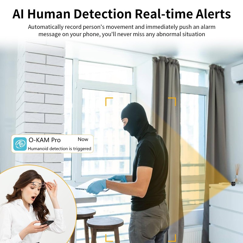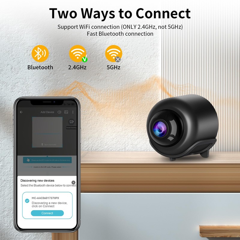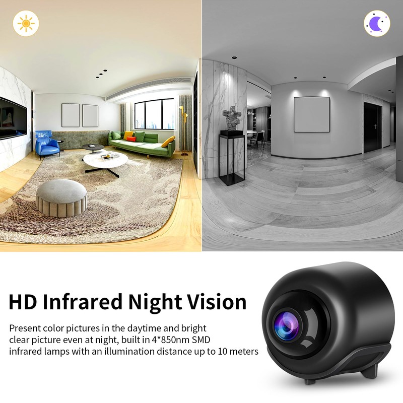 • 【Infrared Night Vision & Motion Detection】 The mini WiFi camera can automatically switch to the infrared night vision at night, with an illumination distance of 5-10 meters. This home security camera will push real-time alarm when human figure is detected