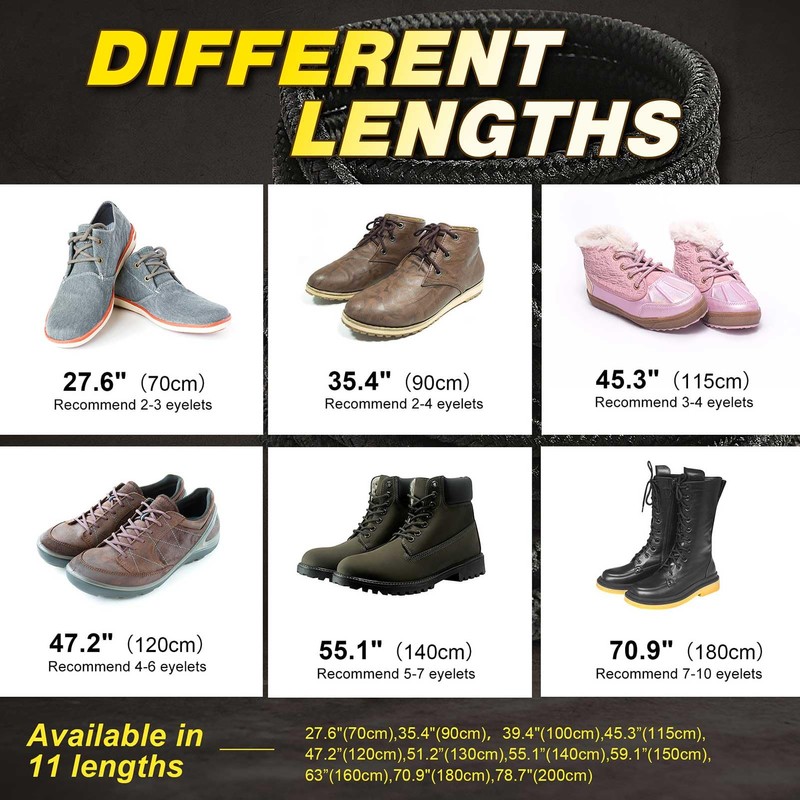 - BOOTLACES FOR MOST BOOTS OR WORK SHOES: Our round boot shoelaces fit for hiking boots shoes, trekking boots shoes, hunting boots shoes, duck boots, wading boots, winter snow boots, snowboard boots, motorcycle boots, safety toe boots, industrial boots, construction boots, Waterproof outdoor work boots, military combat boots, tactical army boots, utility boots, police boots, moc toe/service/packer/logger boots, sneakers, athletic shoes, golf/tennis/basketball shoes, and so on.
