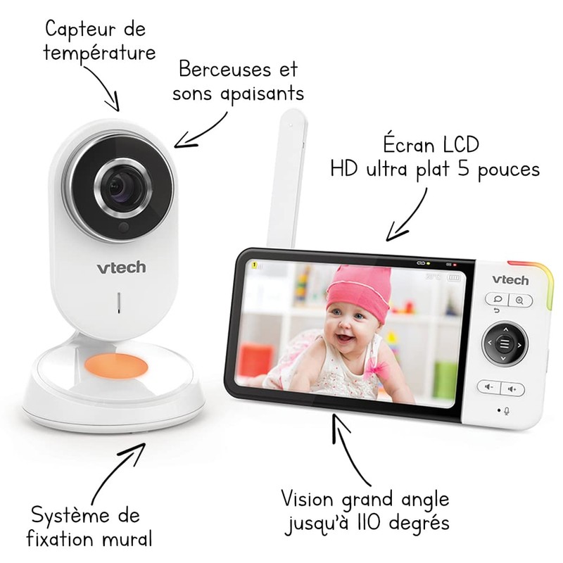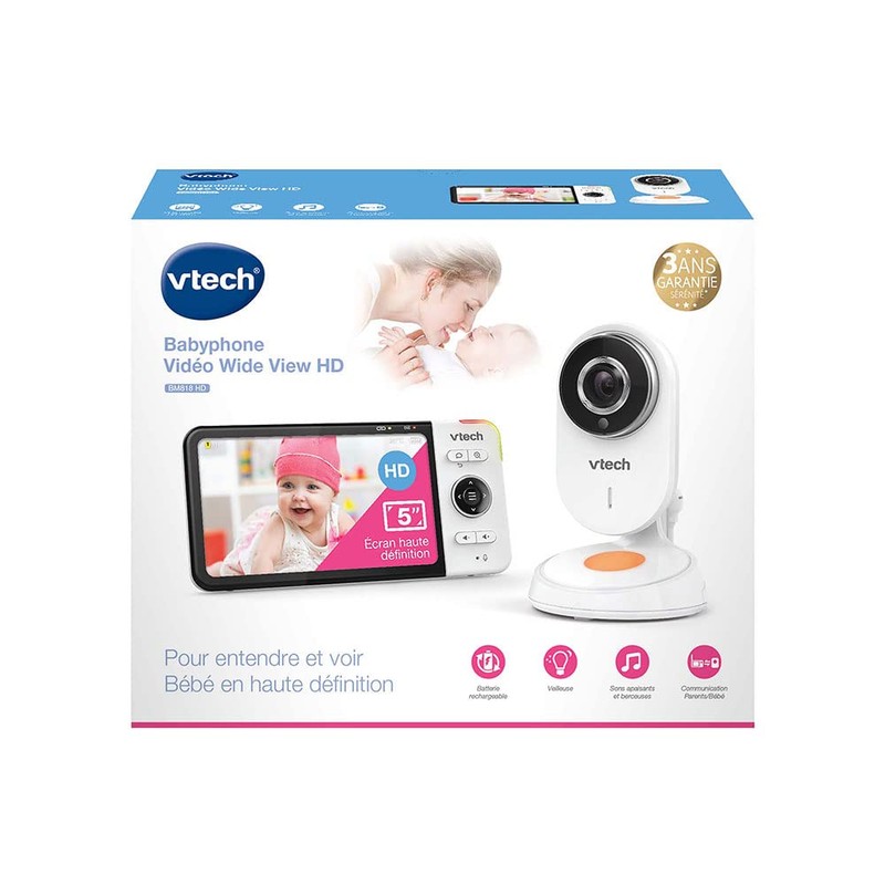 VTech - BM818 – Video-Babyphone Wide View HD – Display 5 Zoll (12,7 cm) Ultra Flach HD – Nachtlicht und Wiegenlieder 720p – Version FR, weiß
