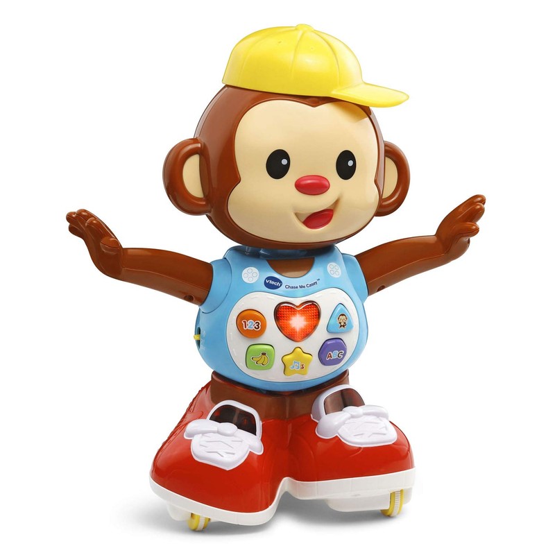 - Five colorful shape buttons on the monkey's shirt introduce letters, numbers, body parts, music and more