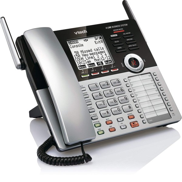Increase efficiency when managing incoming calls with this silver VTech four- line office phone. Keep contacts organized in this phone's directory, which has a capacity of approximately 100 names and numbers and a 32-number speed dial. Each line has a customizable automated attendant that includes forwarding calls, and the digital answering system records 180-minutes of messages. This CM series VTech business phone Small Business System console enables multitasking with its full-duplex speakerphone option making it possible to speak while organizing files or replying to emails. Conference phone allows for multiple participants to converse simultaneously. Compatible with up to four lines for expanded calling capabilities. Reliable DECT 6.0 digital technology enhances audio quality for ultra-clear, buzz-free communication. Monochrome LCD display for clear viewing. Answering system to avoid missing important business messages. Speakerphone keeps your hands free. Intercom for easy organization. Caller ID/call waiting lets you see who's calling. The VTech phone system gives busy workers functional options, including a hands-free headset, a desk set and a 32-number speed dial, to streamline efficiency and allow for multitasking. Use this system to add some personality to your messaging system with customizable hold music, and store up to 100 employee names in a custom directory for simple connectivity.Hands- Free OptionsChoose between using a hands-free headset and a desk set with this expandable phone system. The hands-free headset option lets you complete other tasks such as filing, copying and transferring calls while still connected to incoming call traffic, eliminating the need for to run back to your desks when the phone rings. Just the touch of a button lets you quickly address customers' needs.Small Business EfficiencyThis phone system comes equipped with a 32-number speed dial to make contacting regular clients and business partners easy.