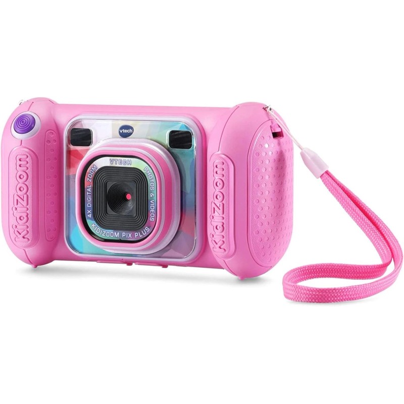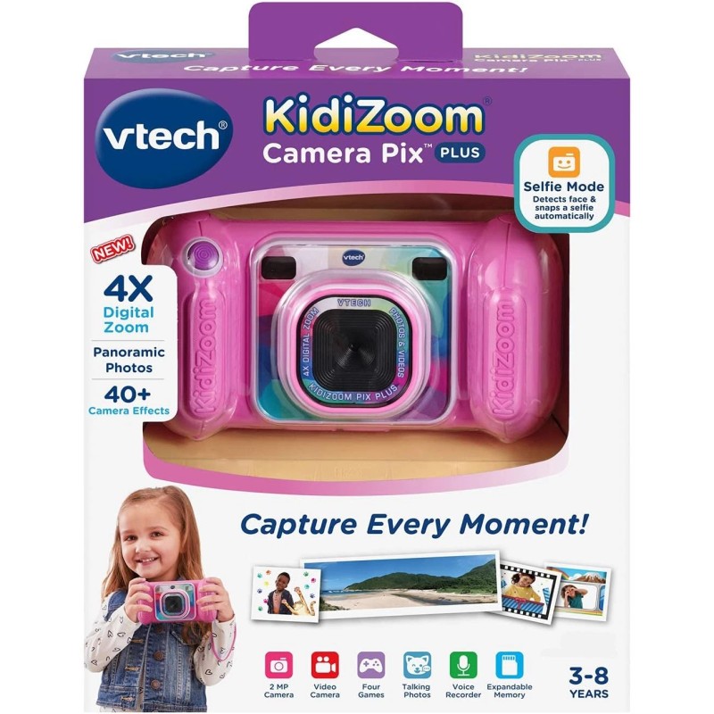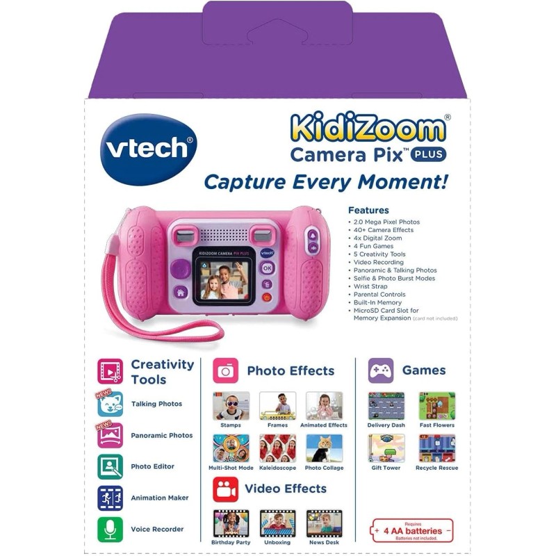 Focus on fabulous photos with the KidiZoom Camera Pix Plus! Inspire curiosity with creativity tools and 40+ camera effects on this 2.0 megapixel camera with 4X digital zoom and 1.8" screen. Create a Talking Photo using your own voice and photo. Apply voice-changing effects, then play it back—your photo appears to talk! In Photo Editor mode, add photo frames, stamps and more. Create a kaleidoscope, a photo collage, or make a video with loads of special effects. Expand your creativity with Panorama mode. Create a panoramic shot by stitching together two to five images. Experiment with Animation Maker and combine up to 100 photos with image overlay technology to create your very own animation. Ready to switch gears? Relax with four built-in games. Have fun with Recycle Rescue, Delivery Dash, Fast Flowers and Gift Tower. This rugged, kid-friendly camera with wrist strap is easy for little photographers to grip and hold. Expand the camera memory up to 32GB, and transfer files to a computer to save them (memory card and USB cable not included). Intended for ages 3–8 years. Requires 4 AA batteries. Batteries not included.