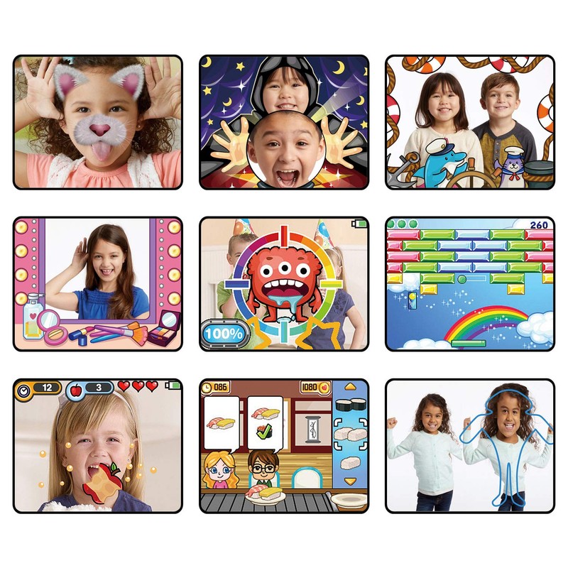 Express yourself in pictures with the Kidizoom Duo DX Camera. You can use the high-resolution, 5 megapixel camera to take great shots and the 2 megapixel rear-facing camera for fun selfies. Create photos and videos with live face filters and fun photo effects. Be a pirate, a cat or a dog! Use the auto- portrait mode to focus on faces while you snap your shots. Augmented-reality games take you on a real-time, real-world monster hunt that encourages problem-solving as you use your movements and the camera to catch the monsters. The MP3 player lets you add music to your camera. This camera also lets you create your own animations. The camera can be adjusted for left- or right-handed kids. Parental control settings allow adults to switch off games and set time limits. Camera is not rechargeable, the included micro USB cable is for file transferring and not for charging. Intended for ages 3-9 years. Requires 4 AA batteries. Batteries included for demo purposes only. New batteries recommended for regular use.