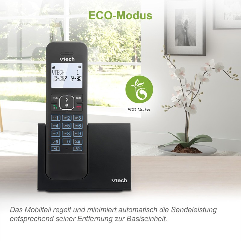 - [ECO Mode] - The handset automatically adjusts the radio frequency power to the distance between handset and base station. The environmentally friendly ECO DECT technology ensures reduced energy consumption.