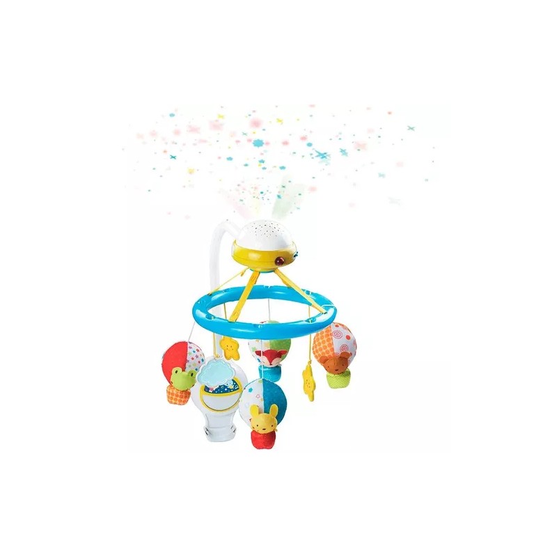 Cuenta con un mando a distancia con botón luminoso para controlar el proyector y un programador de tiempo para las melodías. La base de la luz es desmontable y se puede utilizar como proyector independiente. Incluye un espejo de seguridad y un sensor de sonido que activa el juguete con el llanto del bebé.