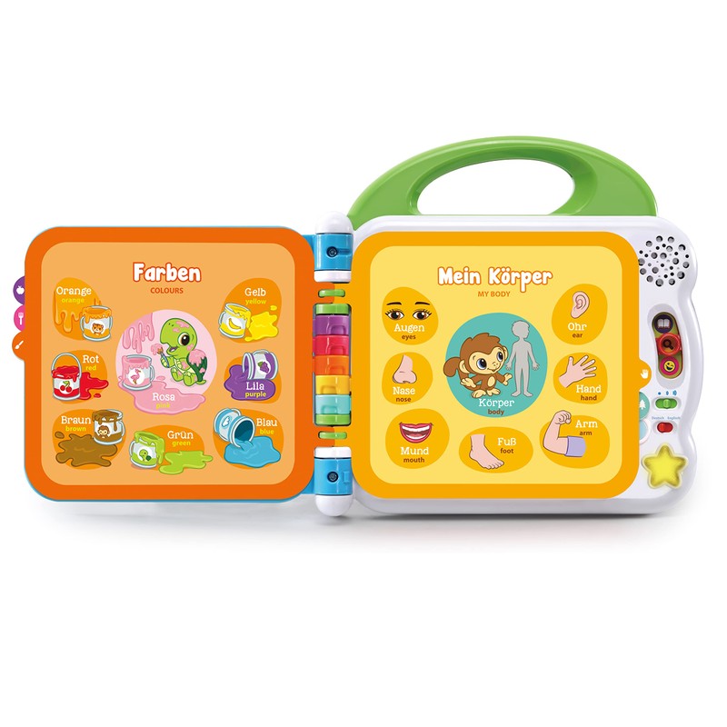 - The luminous star button triggers 2 songs in English or German language and encourages the child to sing along - a children's book with music for cheerful language promotion