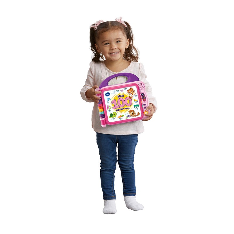 - Box contents: 1 x Vtech My 100-word book pink / picture dictionary with volume control, voice switch and automatic switch-off / German version / 2 x AA demo batteries / item no. 80-601554