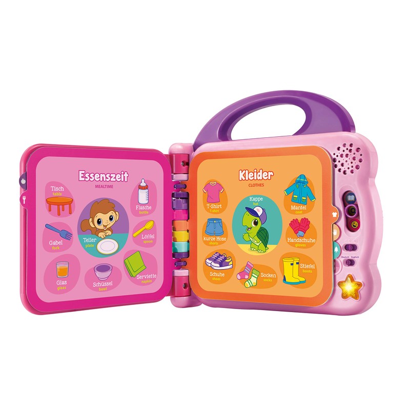 - Learning fun on 12 pages: when the child taps on the individual elements of a page, they learn creatively over 100 English and German words - with the voice switch the language can be set