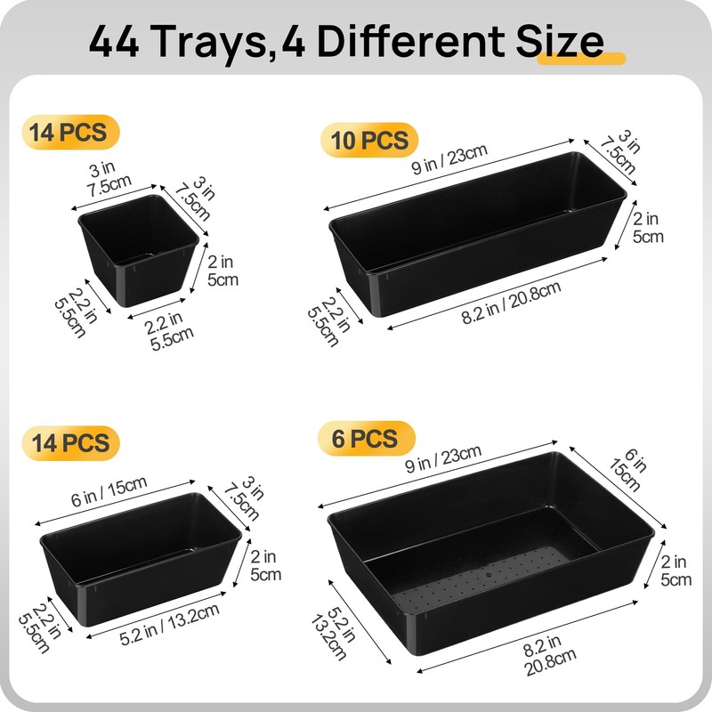 Vtopmart 44 PCS Plastic Drawer Organizers Set, 4-Size Versatile Bathroom and Vanity Organizer Trays, Non-Slip Storage Containers for Makeup, Jewelries, Bedroom,Kitchen Utensils and Office, Black