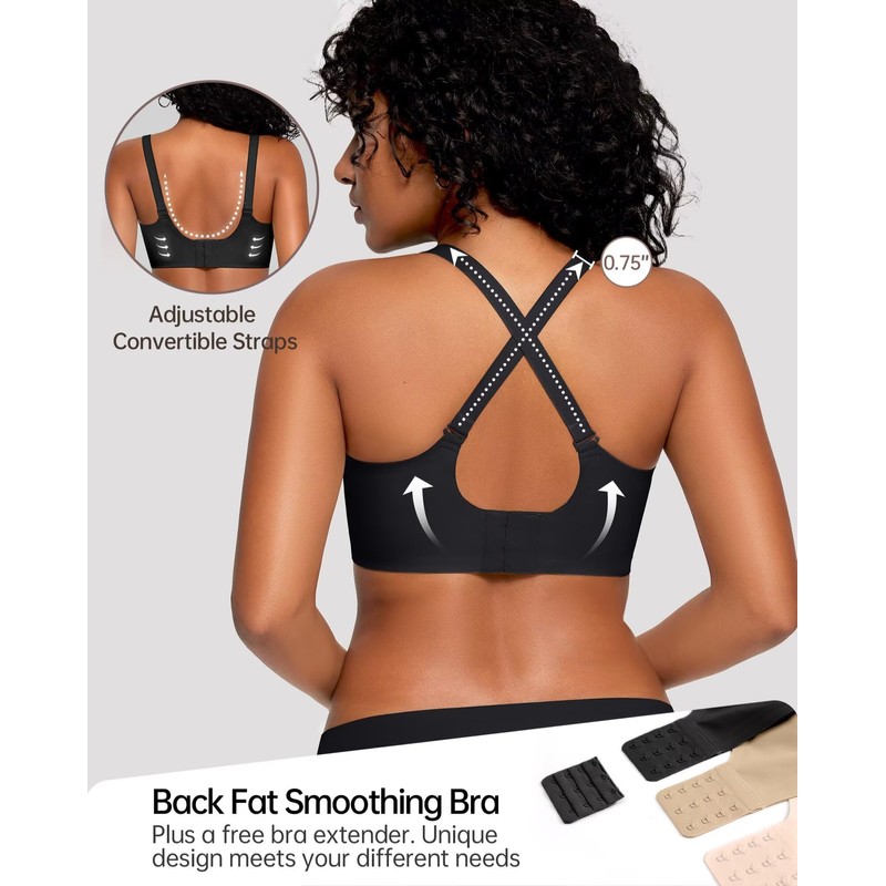 - 【Adjustable Shoulder Straps】 These supportive bras for women feature adjustable, non-slip strapsand an extension buckle with 4 rows of hook-and-eye closures for a custom fit. The widened straps offer effective support and stay put all day without digging into shoulders. The U-back design and wide side wings help hide underarm bulge and back fat, offering extra support