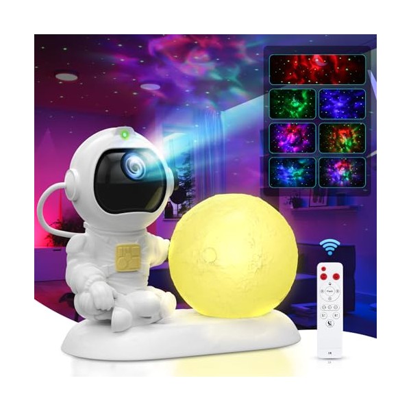 - Star Lights Projector + Galaxy Projector + Night Light: The moonlight next to the cute astronaut's hand is a night light with 7 colors. If you want to see an amazing galaxy and twinkling stars, or want to have an amazing night light in your bedroom, this astronaut light projector must be your best choice.