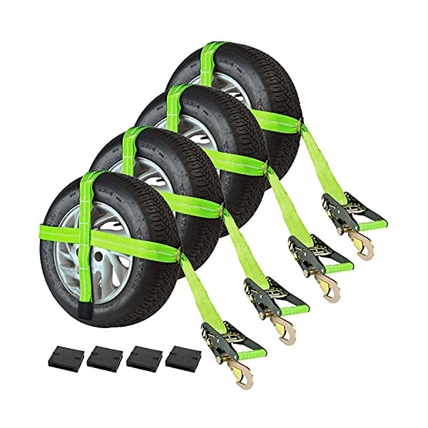- UNIQUE HIGH-VIZ WEBBING - Flexible ultra-bright neon green straps are extremely visible on the wheel in daytime light conditions, and the special retro-reflective fibers shine brightly at night for extra visibility in low light conditions. This extra thick tie down webbing is thick and strong for excellent durability and long service life.