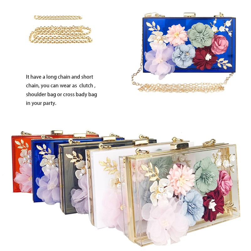 - 👝【Sturdy & waterproof material】: The transparent Evening Bag is made of Acrylic material, which is strong. Surface are decorated by variety pearls and artificial satin flowers,make you quite stand out on special occasion.The waterproof nature of the product can also prevent your items from being splashed by water and will not be easily cracked, the lock, hand strap, and chain of the bag are all made of a sturdy gold metal, sturdy and simple.