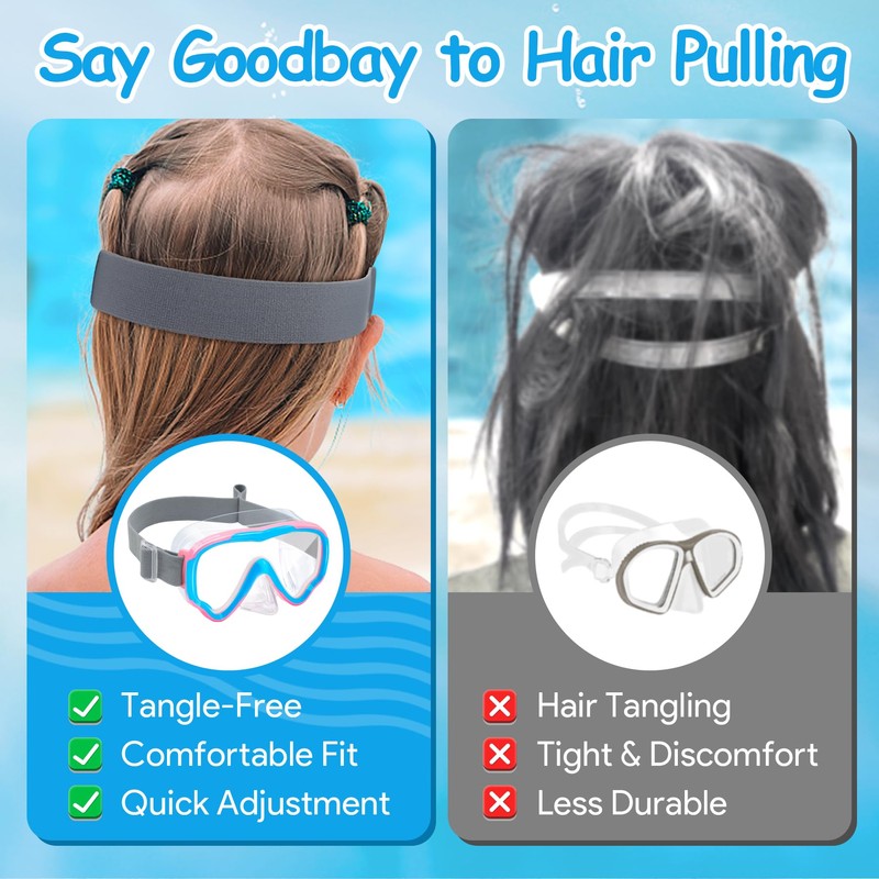 - 【Auto Speed Fit Clips & Ultra Comfortable Elastic Strap】The side adjustment clips are very easy to adjust, kids can adjust themselves, and gently pressed to adjust the length of the strap. The high elastic head strap on the swimming goggles is suitable for different head shapes, widened design, and no hair pulling while wearing it (Highly recommended for kids with long hair!)