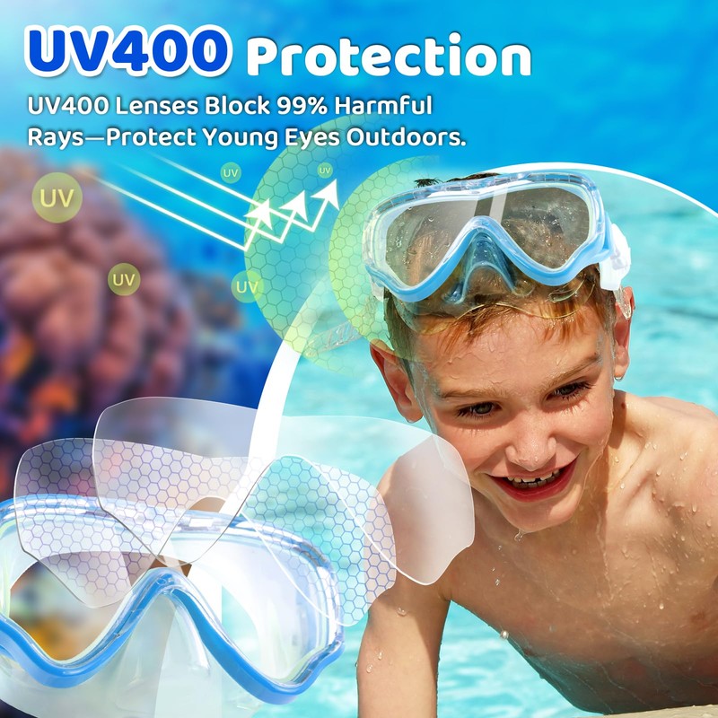 - 【Shatter-Resistant Lens with Clear Vision】 The one-piece PC shatter-resistant lens is your child's window to the underwater world. Not only is it safe and unbreakable, but it also offers a full 180-degree view. With UV protection for eye safety and an anti-fog coating for clear vision, every dive becomes an adventure of discovery.