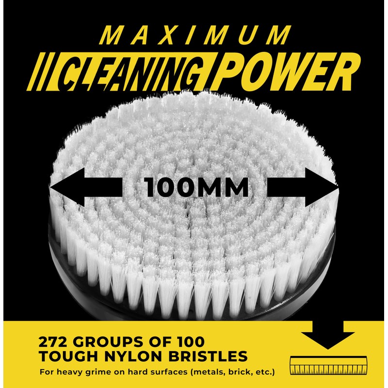 - Maximum cleaning power: Our 4” Hard scrub brush is composed of 272 groups of 100 tough nylon bristles. Each bristle is 20mm long, so they can flex to hug any shape of surface you are cleaning.