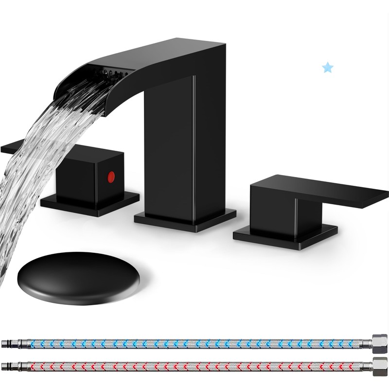 VVXLIV Bathroom Sink Faucet 3 Hole, Matte Black Waterfall Bathroom Faucets, 8 Inch Widespread Bathroom Sink Faucet with Pop-up Drain and Supply Lines, Two Handles for Vanity, Lavatory, Restroom