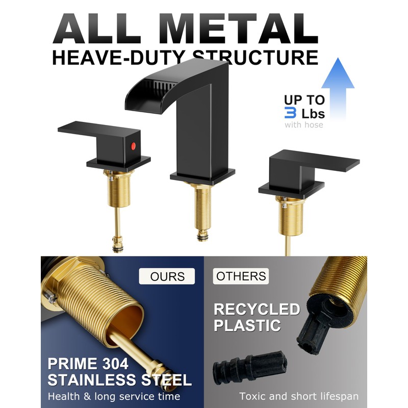 - Upgrade Pop-up Drain: Abs push & seal pop-up drain included. The whole widespread bathroom faucet drain is made of A++ grade Abs to offer rust-free and durable use without leaking. An updated pop-up drain in the waterfall faucet for bathroom sink and overflow hole will help you block the hair etc into the pipeline. Also, pop up drain design 3-hole bathroom faucet is easier to install and use than a traditional lift rod drain.