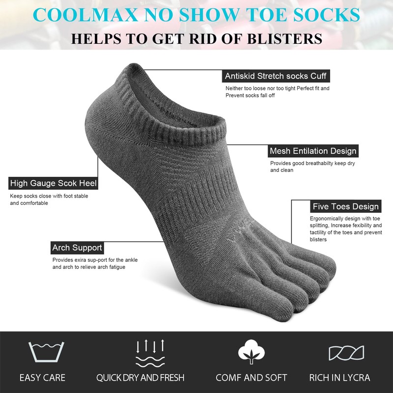 - Five Toe Design: With an unique 5 toe design, lightweight No show toe socks for men allow every toe to relax freely, which effectively prevent blistering caused by friction, giving you best comfort when you are running, climbing or training