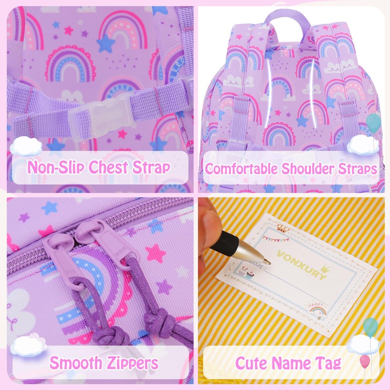 - Cute and Creative Design:VONXURY kids backpack will inspire your kids’ imagination and curiosity in their daily life.Constructed from light-weight and water-resistant soft polyester materials which is friendly to environment. Durable Toddler backpack provides good protection for your little child’s books,homework and other values