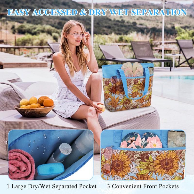 - Waterproof sandproof. Made from high-quality lightweight fabric. Smooth SBS zips ensure the durable use of the pool bag. Its waterproof compartment design makes this elegant bag the best choice for outdoor activities or tote bag