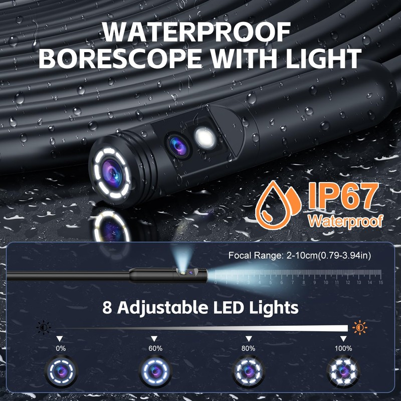 - 8 LED Light and IP67 Waterproof Camera: This endoscope camera with light has an IP67 waterproof 8mm camera rating to withstand harsh weather and humid environments. The Borescope's probe is equipped with 8 LED lights with 3 adjustable brightness levels to ensure clear images even in dark conditions. The Borescope is also fitted with a headlamp on the top of the borescope, which can be used for auxiliary illumination.