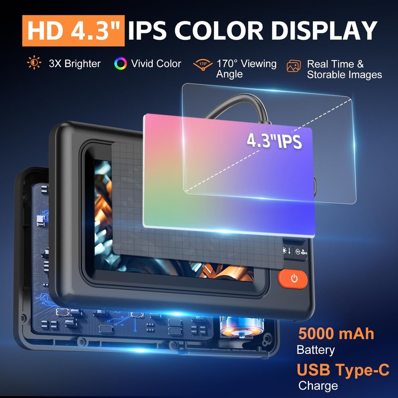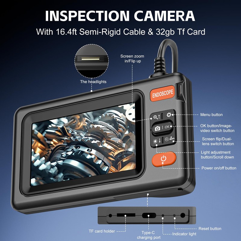 - 1920P Display and Powerful: The HD inspection camera comes with a 4.3-inch IPS screen and a 32GB card, allowing you to view clear images in real time, and videos can also be stored. The exam camera utilizes dual lens technology to switch viewing angles, and 180° Flip Button provides a 180° screen transition, which is very convenient for us to observe. Experience a crystal clear view with our 1920P HD endoscopic camera, perfect for close-up examinations in tight spaces.
