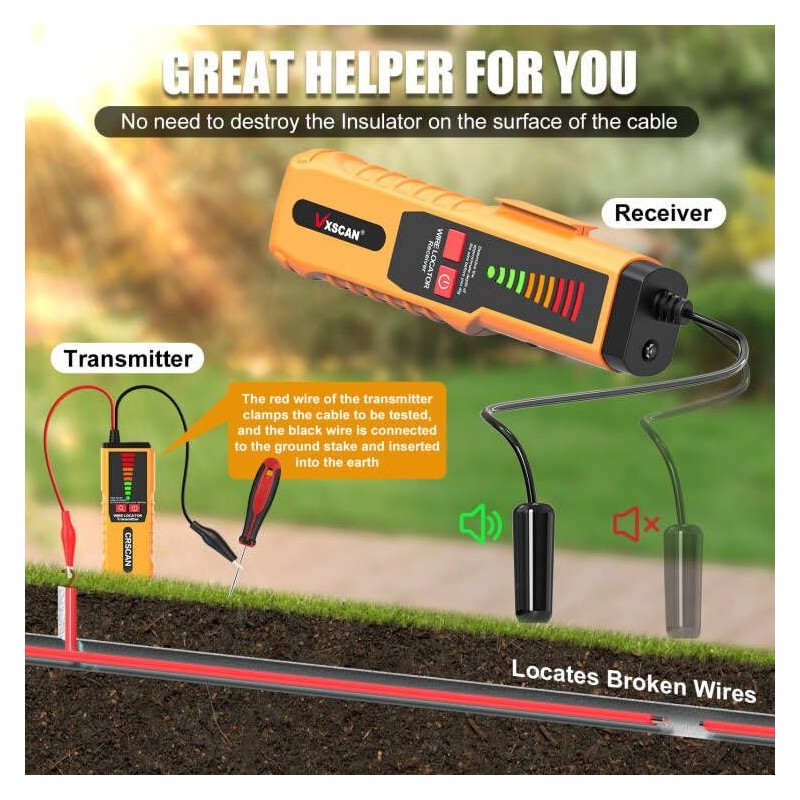 - [New Upgraded - Underground Wire Tracer] The VXSCAN F04 Underground Wire Locator adopts new transmission and reception technology, which enables quick and accurate location and tracking of buried and hidden wires. This cable locator can also determine the breakpoint and direction of the cable without damaging the insulator on the cable's surface. With this cable tester, you can easily detect and repair broken cables, making the process convenient and efficient