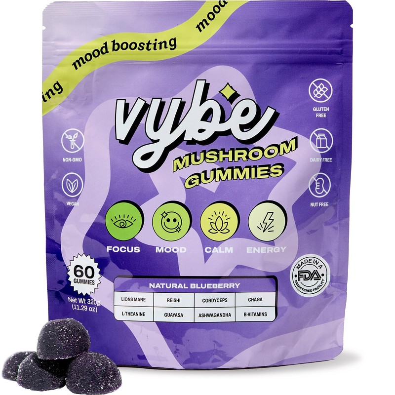 Vybe Mushroom Gummies for Focus and Energy - All-In-One Daily Mushroom Supplement - 8-in-1 Adaptogen Supplement Blend with Lion’s Mane, Cordyceps, Reishi, Chaga, Ashwagandha (Blueberry, 60-Count)