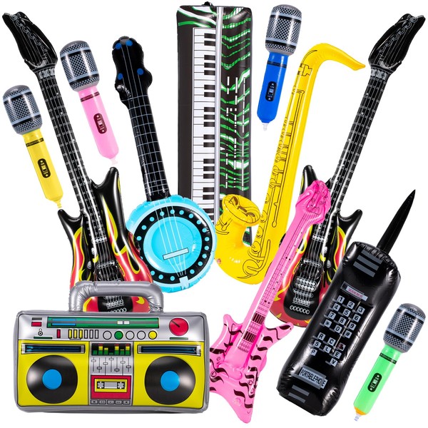 - Inflatable Rock Star Toy Set: This set includes 2 inflatable flame guitars, 4 inflatable microphones, 1 inflatable lute, 1 inflatable phone, 1 inflatable saxophone, 1 inflatable bass, 1 inflatable boombox, and 1 inflatable piano. With a variety of styles, it caters to all your 80s and 90s party decoration needs.