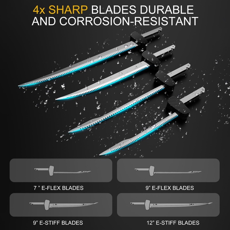 - 【Four Versatile Blades】 VynNetic electric knife comes with four detachable blades, each coated with TiN stainless steel for lightweight, corrosion-resistant performance. The portable case includes: ① 7” E-FLEX blade for white perch and white fish; ② 9” E-FLEX blade for catfish; ③ 9” E-STIFF blade for whiting fish and flatfish; ④ 12” E-STIFF blade for tuna and salmon. Choose the appropriate blade based on the type and size of fish or meat for optimal cutting results