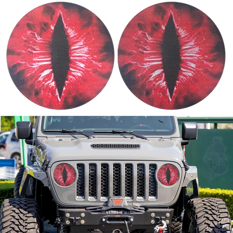 - 【Product Size & Package】The size of these beast eyes headlight decals for jeep is 7.87in*7.87in (20cm*20cm). When posting on the vehicle, you may need to cut it to fit the headlight better.Package includes: 2 pieces of headlight eyes decals for jeep
