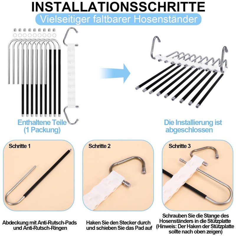 - Open design and easy to install: This trouser organiser for the wardrobe is equipped with an open end so you can easily put on and take off your trousers, perfect for everyday use and storage. You can easily assemble it to save space in the wardrobe and say goodbye to crowded and messy cabinet compartments.