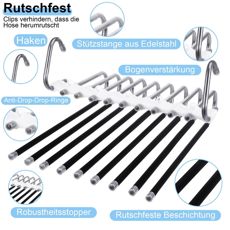 The magic trouser rack is made of high-quality, non-slip silicone to prevent clothes from falling off the stand by tilting. The plug at the end prevents your clothes from scratching when pulling out, and ensures non-slip resistance so that your trousers do not slip down. This trouser organiser for the wardrobe is equipped with open ends so you can easily put on and take off your trousers.