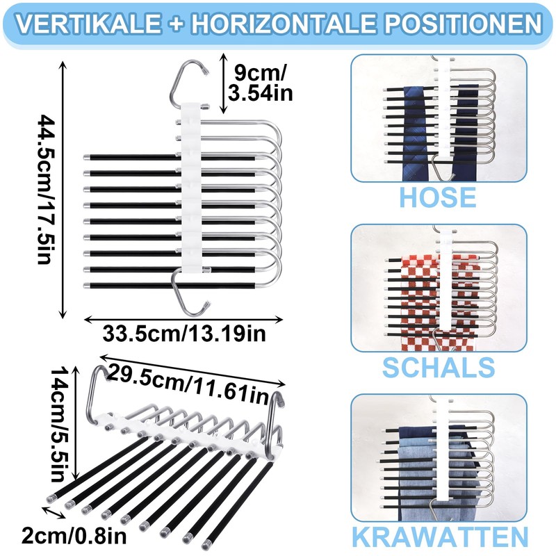 Pants hangers replace the plastic hooks with strong, durable and high-quality stainless steel hooks. The hooks have a high load capacity, are stable and easy to use. Two uses of the trouser organiser can be used horizontally or vertically, so you can choose the suspension depending on your wardrobe.