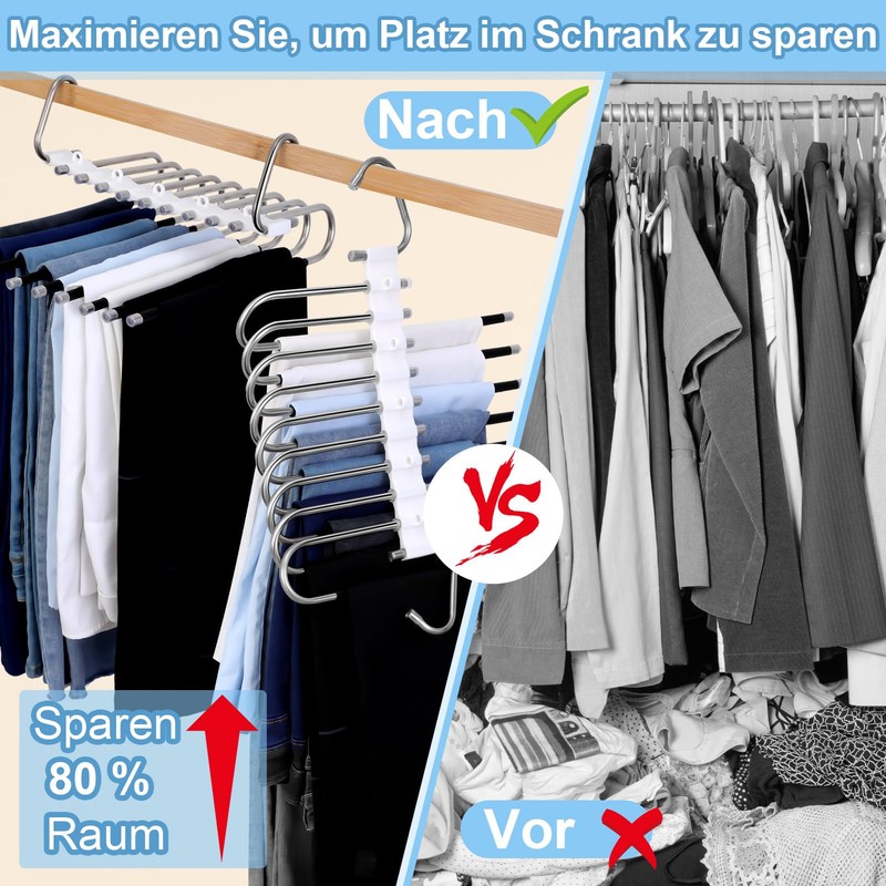 - Escalate 9 levels of trouser hangers: improved 9-in-1 trouser stand, pack of 2, each stand can hang at least 9 pairs of jeans/trousers/scarves at the same time, saving up to 80% horizontal storage space. Your trousers stay in their natural shape without throwing wrinkles, and your clothes remain compact and orderly, solving the problem of organising your clothes.