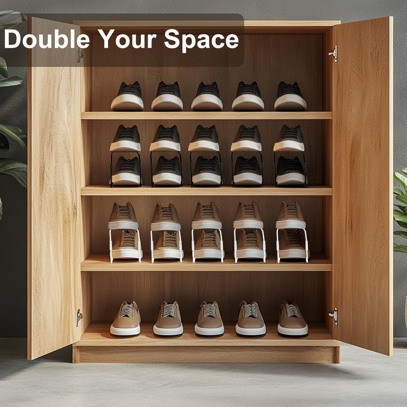 - Space Saving Shoe Stackers: Perfect for those tight space! This double-layer shoe rack is a real space saver. lt can be neatly tucked awayin your existing shoe cabinet, maximizing the limited storage area. Alternatively, use it as a shoe divider on shelves, doubling the storage capacity without taking up much room.