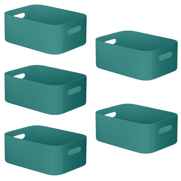 W&H 5 PCS Plastic Storage Boxes with Handle, Medium Plastic Storage Baskets, Rectangular Home & Kitchen Organiser, Storage Boxes for Bathroom, Kitchen, Office and School - 25×17×10cm (Green)