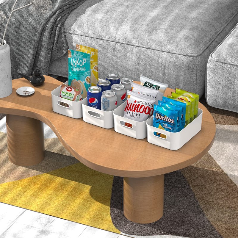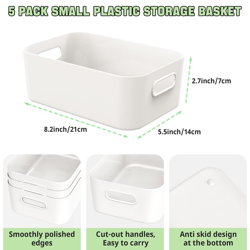 - ✔️【5 WHITE STORAGE BOXES】: Uniform Color - White, 5 Storage Baskets. To meet daily needs while unifying the style, the whole is versatile and avoids abruptness. It can be placed on the desktop to store debris and keep the desktop clean and tidy. Dimensions: 8.2 x 5.5 x 2.7 Inch.